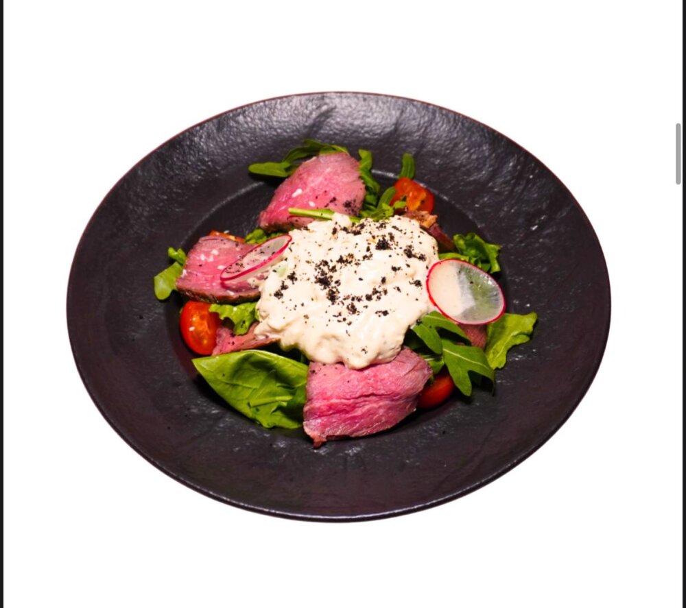 Нарезанный ростбиф,свежый микс салата и руккола,томаты черри,нежный соус из каперсов,зернистой горчицы и тунца