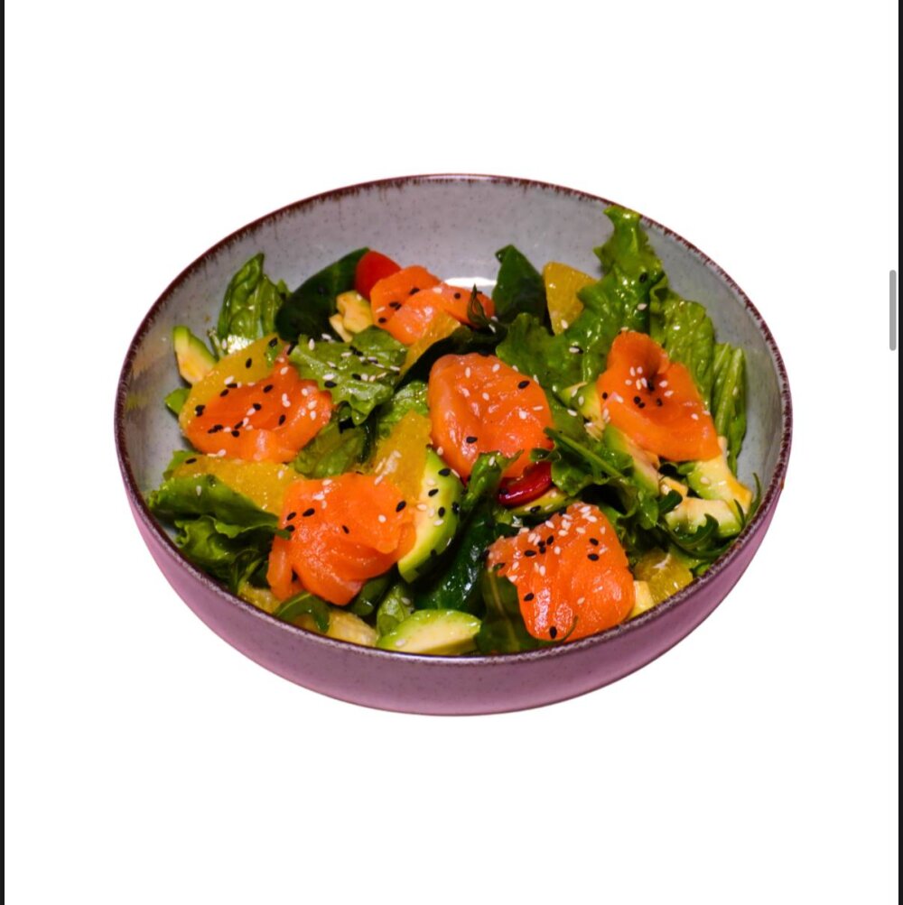 Свежий салат с семгой ,авокадо и апельсином.Микс салата,черри,терияки и греческая заправка,сверху кунжут